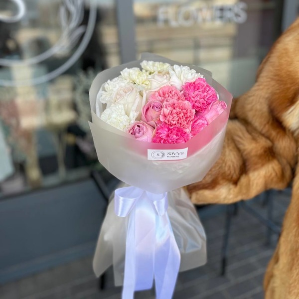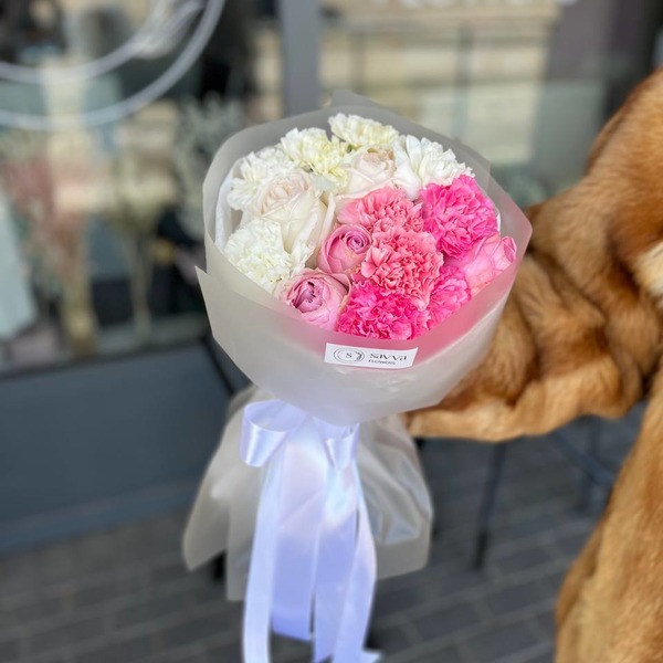 "Muse : A sophisticated bouquet of Carnations, pink rose, white rose."