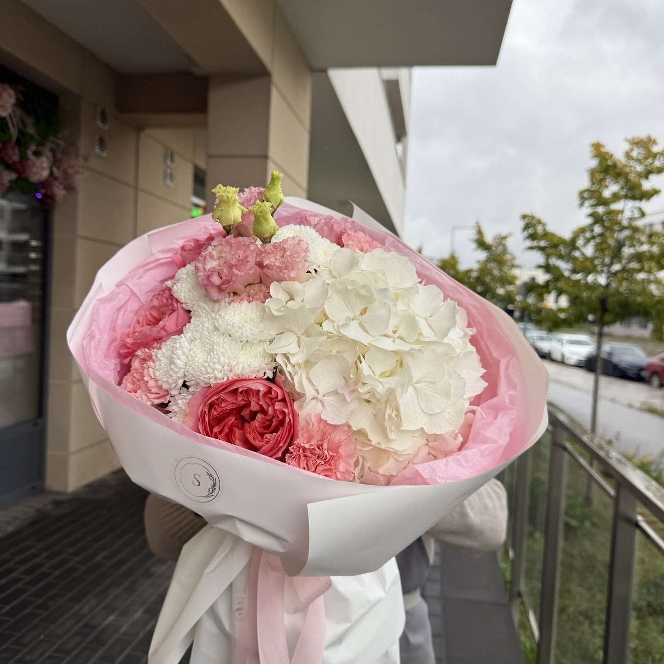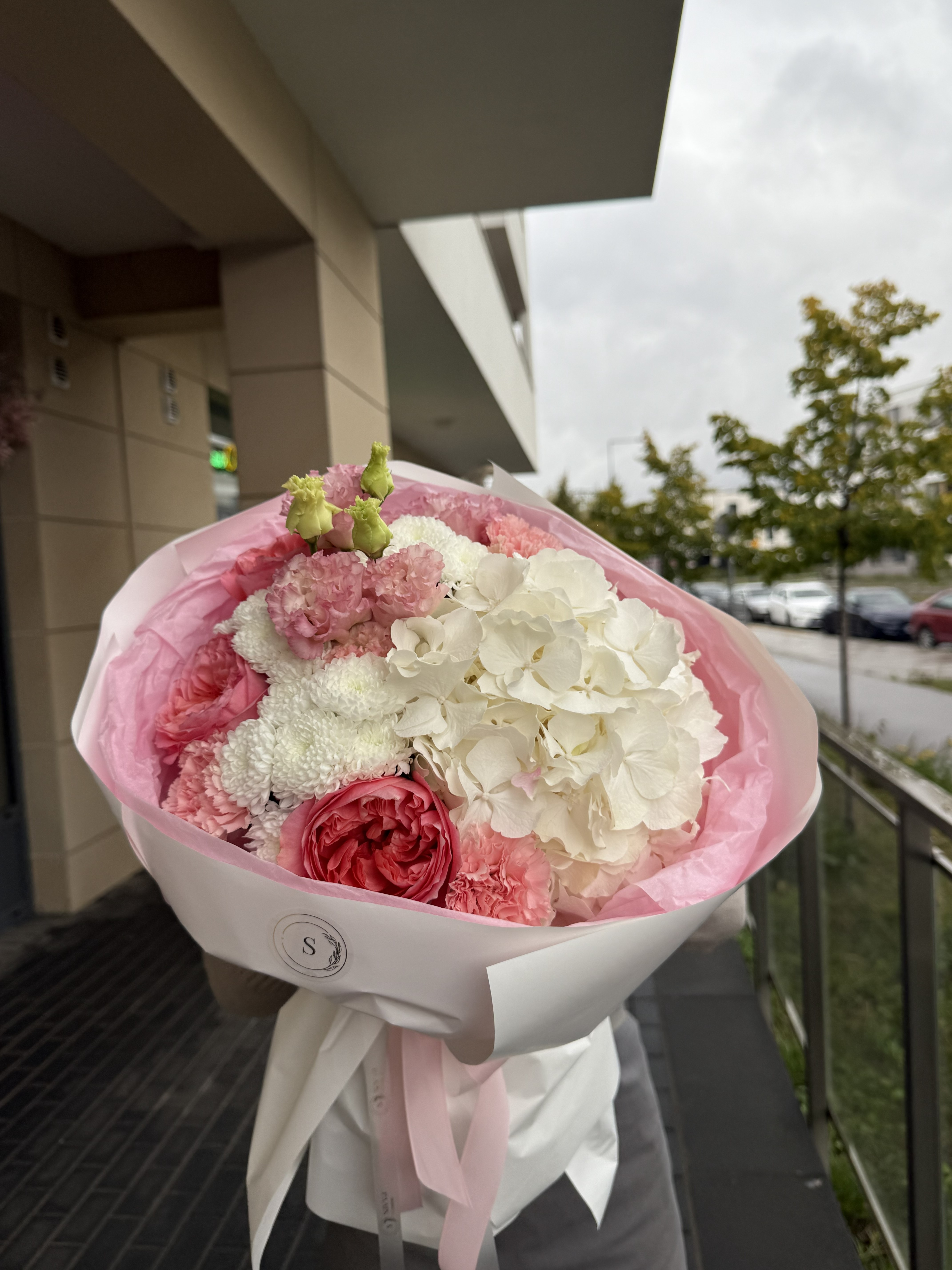 "Состав: Гортензия , эустома , одноголовая роза , гвоздика , хризантема."