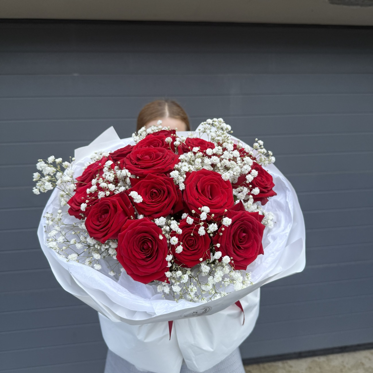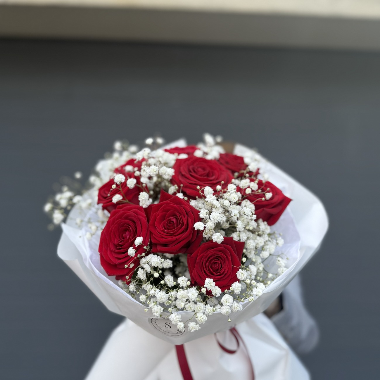 В состав букета входит : Гипсофила белая и розы красные.