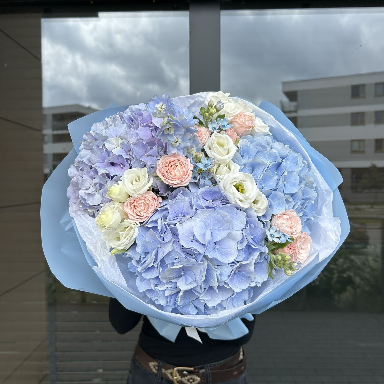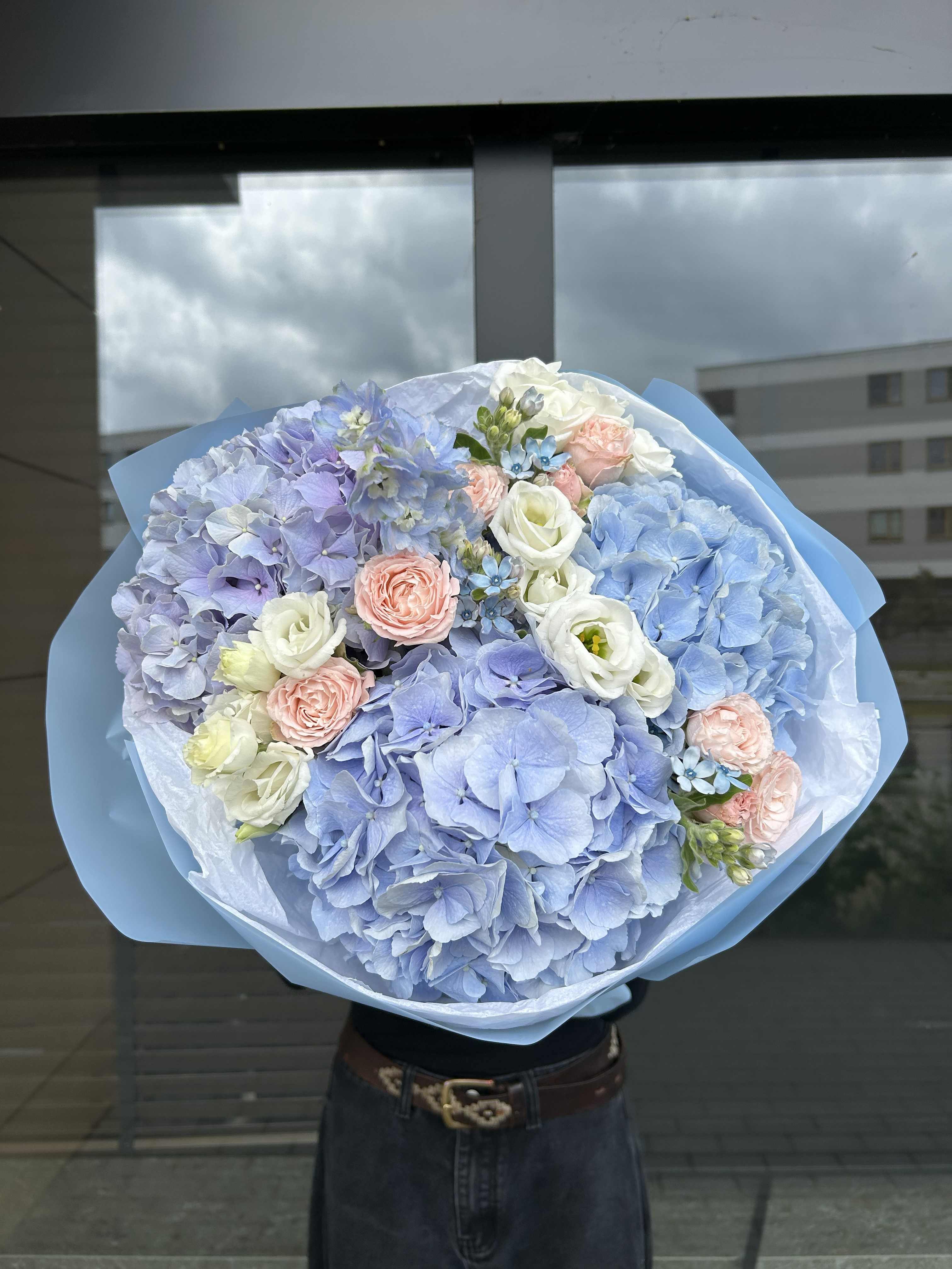 В этом букете представлены: гортензия , кустовая роза , эустома , оксипеталум.